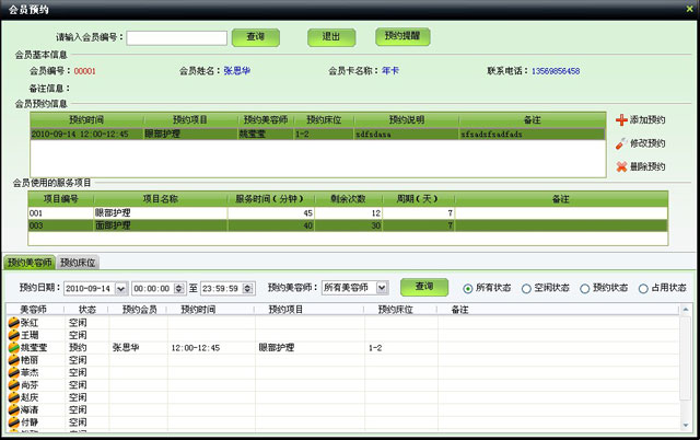 | 在某段時間內預約某美容師和床位,設置后將在預約到達時間前進行提醒。美容師和床位不能重復預約。 | |