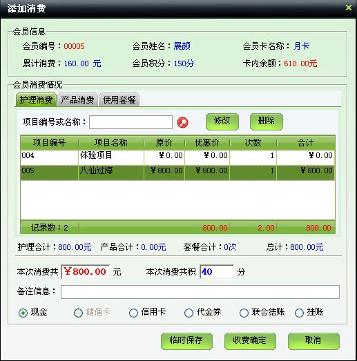 | 一次消費可以包括服務(護理)、產品、套餐三種,可為每一項添加服務人員和床位,結賬后計算提成。付款方式非常方便,現金、信用卡、代金券等常見結算方式都有。 | |