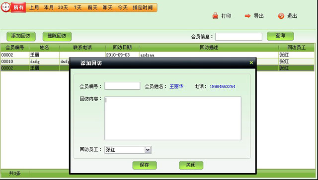 | 回訪包括兩種,一種是對已做過護理的的顧客進行回訪,另外一種是自定義的回訪。 | |