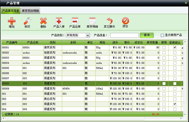| 包括產品基本信息管理、入庫、出庫等操作,可設置產品套裝 | |