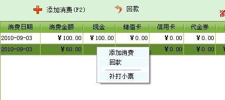 | 在消費記錄中右擊鼠標,彈出菜單中有補打小票選項,可對賬單進行補打。 |
