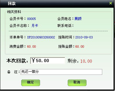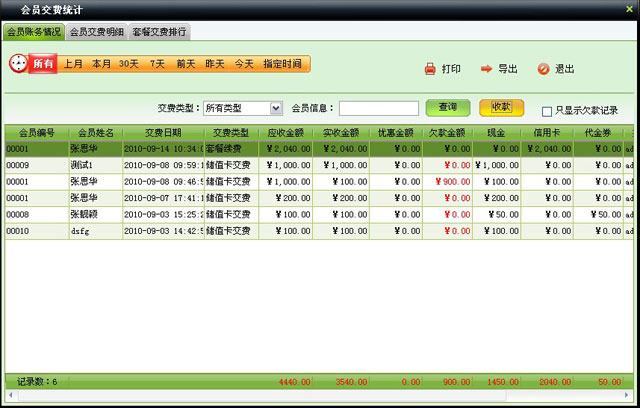 | 包括會員賬務情況、會員交費明細、套餐交費排行。其中有一個收款功能是針對充值時欠款進行還款的操作。 | |