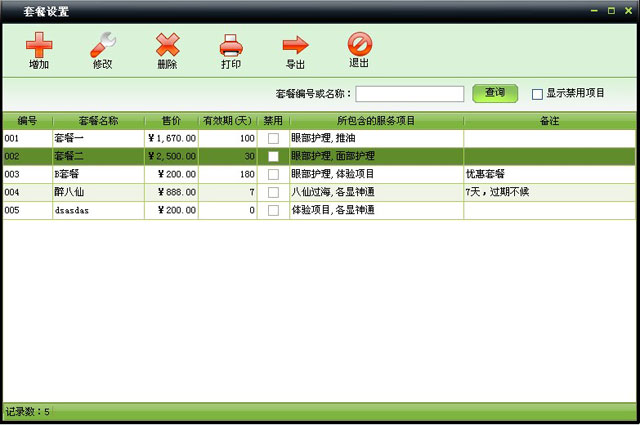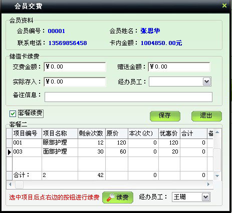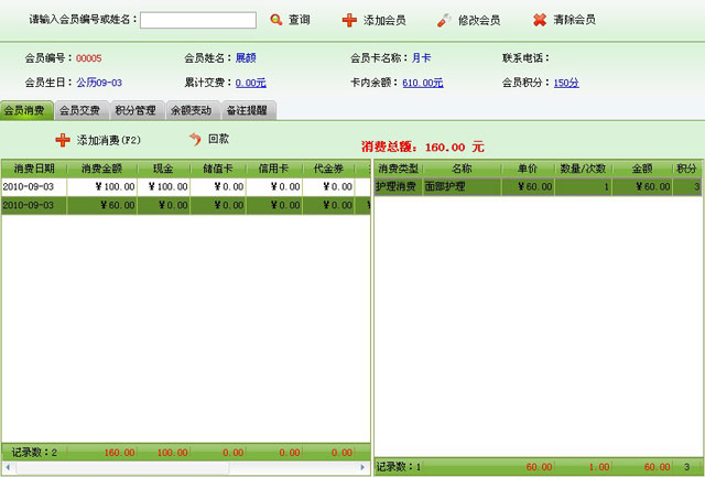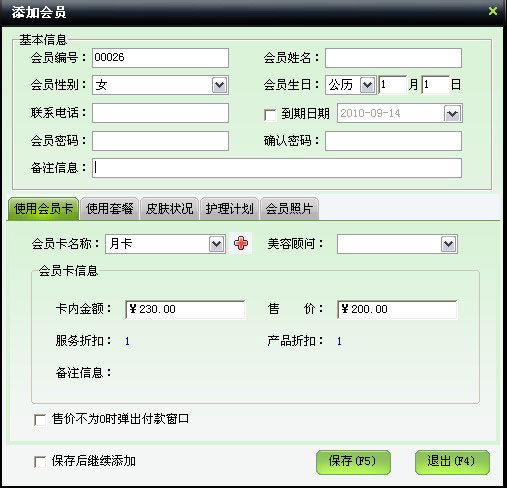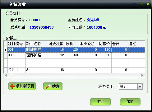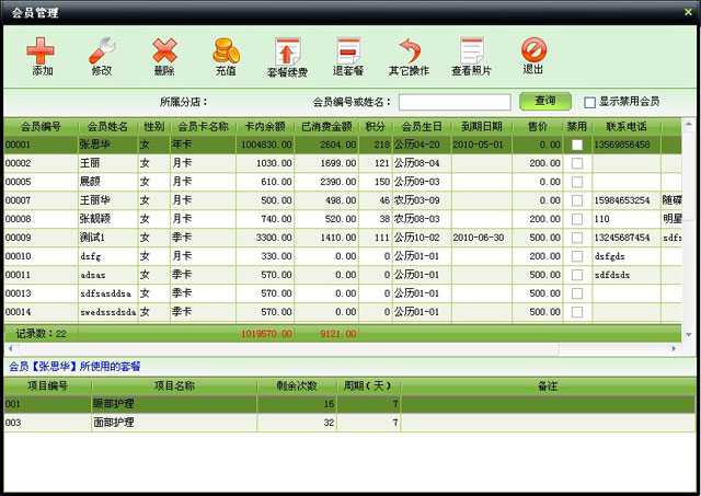 | 包括會員基本信息、本卡售價、業(yè)務員工、使用套餐、皮膚狀況、護理計劃、會員照片等信息 | |