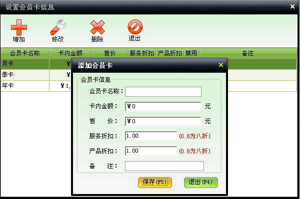 | 包括兩項,儲值卡充值和套餐充值。充值可以贈送金額,可以選擇員工進行提成。 | |