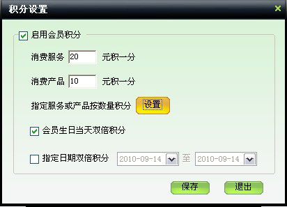 | 可設置消費服務項目多少元積一分,消費產品多少元積一分,會員生日當天雙倍積分,指定日期雙倍積分,也可以單獨指定消費幾個數量的產品或服務。 |