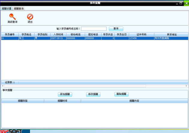 在學(xué)員管理中點(diǎn)擊“事件提醒”進(jìn)入事件提醒界面如圖: