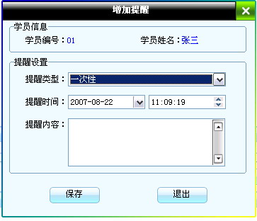 在窗口中上半部顯示的是所有的學(xué)員,下半部顯示的是當(dāng)前選中學(xué)員的提醒記錄。選中一個(gè)學(xué)員然后點(diǎn)擊“添加提醒”打開添加提醒窗口如圖:
