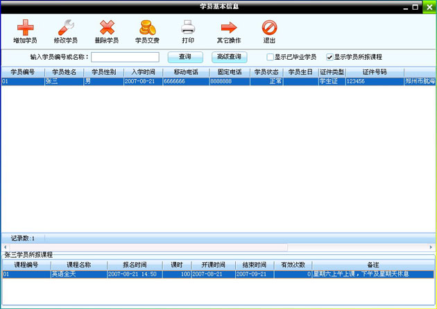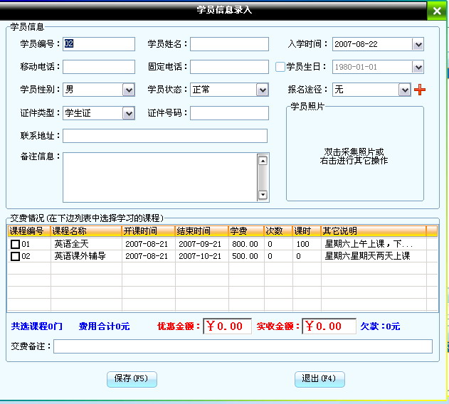 該窗口分兩部分:上邊是錄入學(xué)員的基本信息,下邊可以選擇學(xué)員所報(bào)的課程和交費(fèi)情況。