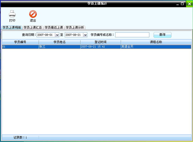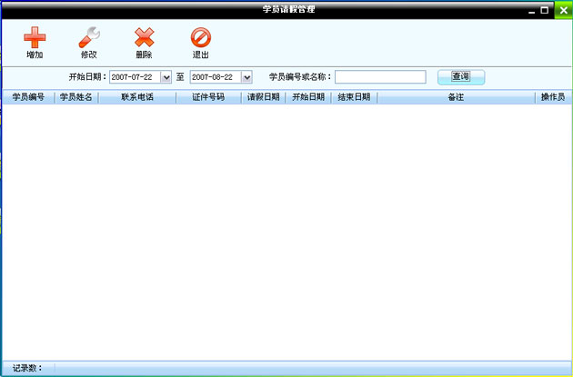 在該窗口中顯示的所有請假的學(xué)員,可以點(diǎn)擊增加按鈕來添加學(xué)員請假記錄。在學(xué)員請假的這段時(shí)間內(nèi)該學(xué)員是不能上課登記的。