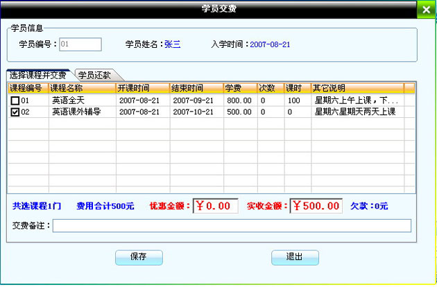 在該窗口中選擇學(xué)員所報(bào)課程,并錄入學(xué)員的交費(fèi)情況即可。