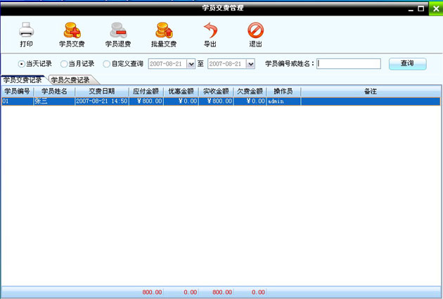 在該模塊中可以查詢到當(dāng)天,當(dāng)月和自定義日期的學(xué)員交費(fèi)記錄和學(xué)員欠費(fèi)記錄。在上邊工具欄中的“批量交費(fèi)”功能是可以根據(jù)情況選擇多個(gè)學(xué)員進(jìn)行交費(fèi)。