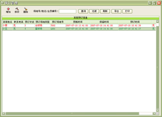 來賓登記→場地開單:每個客戶發(fā)生消費前必須進行登記(建立客戶帳),給客戶安排一個場地,場地項目必須是在“系統(tǒng)設(shè)置”模塊中的“場地設(shè)置”中已經(jīng)設(shè)置,系統(tǒng)只能對已設(shè)置的場地進行登記。