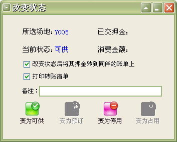 來客登記→更換場地:假如因為店內(nèi)原因或客人要求,造成客人當(dāng)前占用的項目必須終止提供,但客人的消費并未終結(jié),為此,可以通過更換場地來將客人資料及消費信息在不進行結(jié)帳操作的情況下轉(zhuǎn)到另一新項目下。例如:換場地。