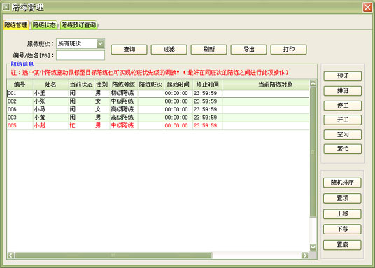 陪練設(shè)置:陪練是指能為賓客提供服務(wù)的本店員工,在此設(shè)置中可增加、修改、刪除陪練信息,還可為每個陪練設(shè)置相應(yīng)的陪練等級(例如:高級陪練、中級陪練、普通陪練等)。有了陪練等級可在商品項目中為每種服務(wù)項目所對應(yīng)的陪練等級設(shè)置相應(yīng)的提成金額(如果有此需求),此項設(shè)置可為賓客提供服務(wù)的陪練自動計算提成金額。