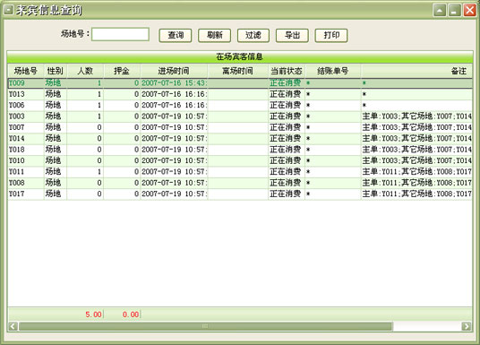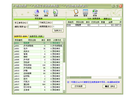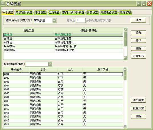 場地:場地可分為羽毛球場地、乒乓球場地和等其它場地(可任意添加多個場地),每個場地就具體到某一登記的賓客,一般把場地提供給一個客人后,在當(dāng)前客人未退出占用狀態(tài)前暫時無法提供給另一個客人消費。此項目在系統(tǒng)設(shè)置中設(shè)置,在場地開單時使用。