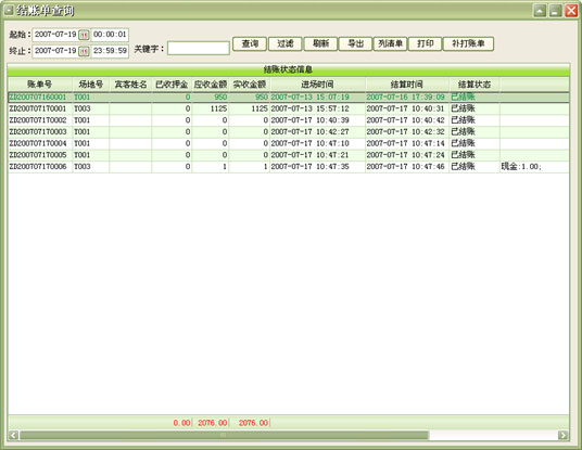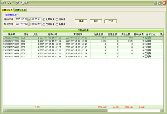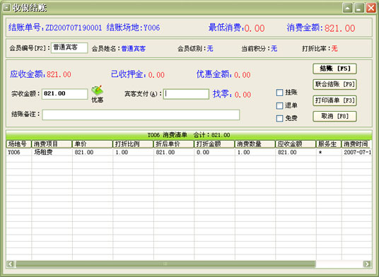 收銀結(jié)賬→賓客結(jié)帳:終結(jié)客戶當(dāng)前的消費活動,并進行收款及自動還原場地項目(場地)的占用狀態(tài)為可供狀態(tài)(或清理狀態(tài))。