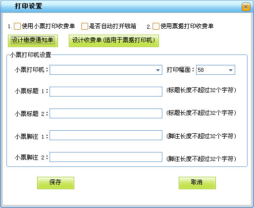 ·此項(xiàng)用來設(shè)置打印收費(fèi)單據(jù)的打印機(jī)和繳費(fèi)通知單的打印格式,在此可對繳費(fèi)通知單進(jìn)行個性化定義,可以設(shè)置收費(fèi)單據(jù)的打印幅面和單據(jù)上要打印的信息。