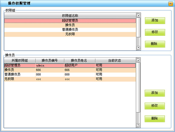 ·用來為使用本軟件的員工分配相應(yīng)的角色即所屬的權(quán)限組(可操作的權(quán)限),相應(yīng)的操作員登錄本系統(tǒng)時只能對屬于自己權(quán)限范圍內(nèi)的功能進(jìn)行操作。做到管理工作的安全順利的進(jìn)行。1.操作方法:先在本窗口的上半部分添加權(quán)限組,權(quán)限組的添加根據(jù)實(shí)際使用情況自由設(shè)置。2.在本窗口的下半部分添加各權(quán)限組相應(yīng)的操作員。