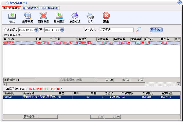 在往來帳務(wù)窗口中共分為三部分:供貨商所有單據(jù)、供貨商商品業(yè)務(wù)情況、供貨商帳務(wù)。