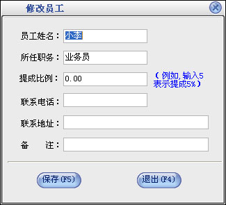 在基本設(shè)置模塊中點(diǎn)擊“員工信息”按鈕打開員工信息窗口如圖7。在窗口中可以看到所有的員工。點(diǎn)擊“增加”按鈕打開增加員工窗口,輸入員工的信息,員工名稱不能重復(fù)。點(diǎn)擊“修改”按鈕可以修改選中的員工信息。點(diǎn)擊“刪除”按鈕可以刪除選中的員工,如果該員工有業(yè)務(wù)發(fā)生則不能刪除。點(diǎn)擊“查找”按鈕打開員工查詢窗口,輸入相應(yīng)的條件查詢不同的員工信息。點(diǎn)擊“全部”按鈕可以列出所有的員工信息。