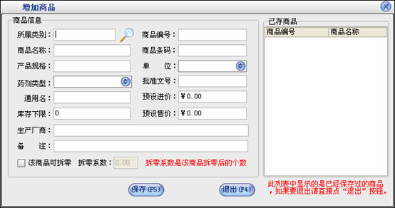 在商品信息這一部分輸入新增商品的所有信息,點(diǎn)擊“保存”按鈕即可把該商品保存到右邊的已存商品中,保存后可以繼續(xù)輸入下一種商品。在“已存商品”中可以點(diǎn)擊鼠標(biāo)右鍵對選中的商品進(jìn)行刪除或刪除全部已存的商品。如果商品增加完后可以直接點(diǎn)“退出”按鈕。退出增加商品窗口后會在商品列表中看剛才增加的商品。如果要修改商品,先選中要修改的商品,點(diǎn)擊“修改”按鈕打開商品修改界面,在商品修改界面中修改相應(yīng)的信息點(diǎn)擊“保存”即可。點(diǎn)擊“刪除”按鈕即可以把選中的商品刪除,該商品發(fā)生過業(yè)務(wù)則是不能刪除的。