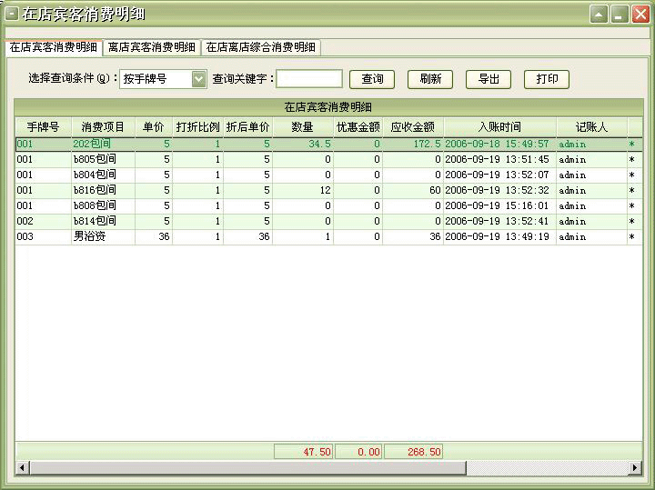 來賓登記→顧客開單:每個客戶發(fā)生消費(fèi)前必須進(jìn)行登記(建立客戶帳),給客戶安排一個包間(手牌)等包間項(xiàng)目,包間項(xiàng)目必須是在“系統(tǒng)設(shè)置”模塊中的“包間項(xiàng)目”中已經(jīng)設(shè)置,系統(tǒng)只能對已設(shè)置的包間項(xiàng)目(手牌)進(jìn)行登記。