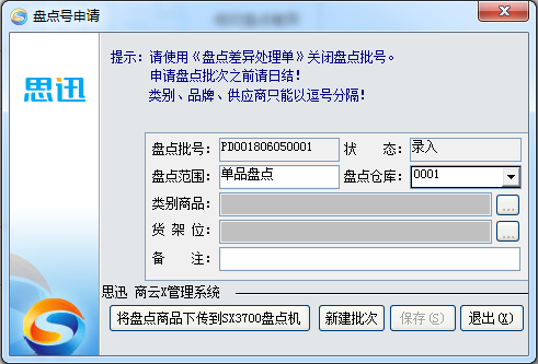 2. 日結(jié)并申請(qǐng)盤(pán)點(diǎn)號(hào):盤(pán)點(diǎn)前審核所有的業(yè)務(wù)單據(jù)、停止出入庫(kù)并進(jìn)行日結(jié)。日結(jié)完成后才能進(jìn)行盤(pán)點(diǎn)號(hào)申請(qǐng),生成盤(pán)點(diǎn)批號(hào)。 在20180605這天營(yíng)業(yè)結(jié)束后審核所有總部的業(yè)務(wù)單據(jù),停止出入庫(kù)并進(jìn)行日結(jié)。打開(kāi)商云X后臺(tái)“倉(cāng)庫(kù)”—“盤(pán)點(diǎn)”—“盤(pán)點(diǎn)號(hào)申請(qǐng)”,因?yàn)橹粚?duì)部分單品進(jìn)行盤(pán)點(diǎn),故盤(pán)點(diǎn)范圍選擇“單品盤(pán)點(diǎn)”,盤(pán)點(diǎn)倉(cāng)庫(kù)為總部倉(cāng)庫(kù)“0001”,點(diǎn)擊保存,如下圖: