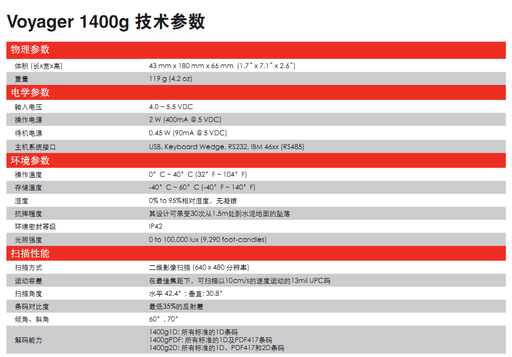 二維條形碼由于各種原因而越來越流行于眾多行業(yè)應(yīng)用中。一些企業(yè)是因?yàn)橄M軌蛟谟邢薜目臻g內(nèi)存儲(chǔ)盡量多的數(shù)據(jù)信息,一些企業(yè)則是為響應(yīng)政府行業(yè)規(guī)章或供應(yīng)商的要求。更多的企業(yè)甚至只是希望在現(xiàn)在或未來能夠利用由二維影像技術(shù)引領(lǐng)的新興趨勢(shì),而無需再去另外購(gòu)買掃描器硬件。Voyager 1400g能夠支持PDF和二維條碼掃描而無需額外的增值功能配置,如先進(jìn)的圖像采集和處理應(yīng)用,從而使霍尼韋爾二維掃描方案的價(jià)格更富有競(jìng)爭(zhēng)力。